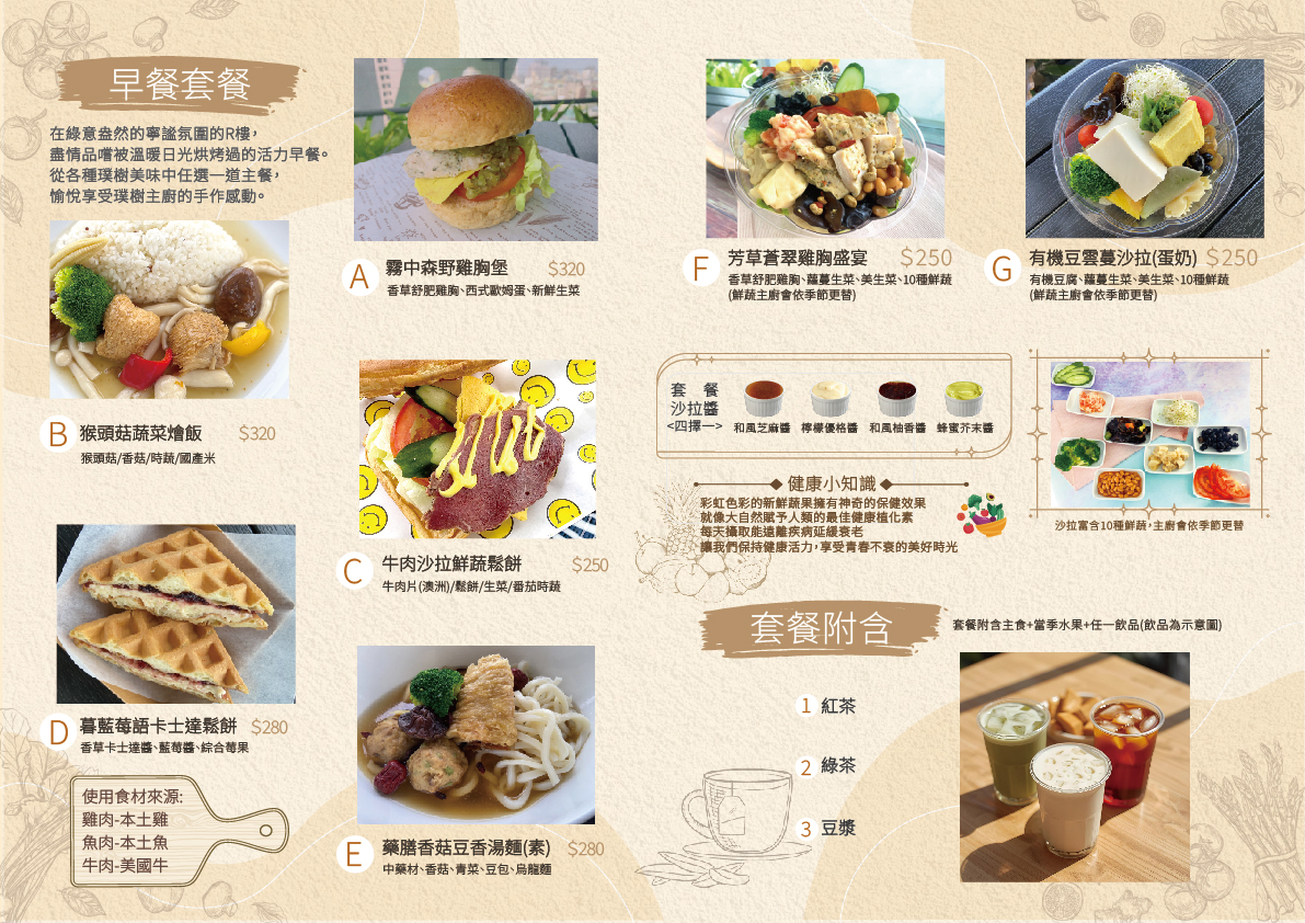 時令主餐 【猴頭菇蔬菜燴飯】、【霧中森野雞胸堡】、【暮藍莓語卡士達鬆餅】、【牛肉沙拉鮮蔬鬆餅】、【芳草蒼翠雞胸盛宴】
